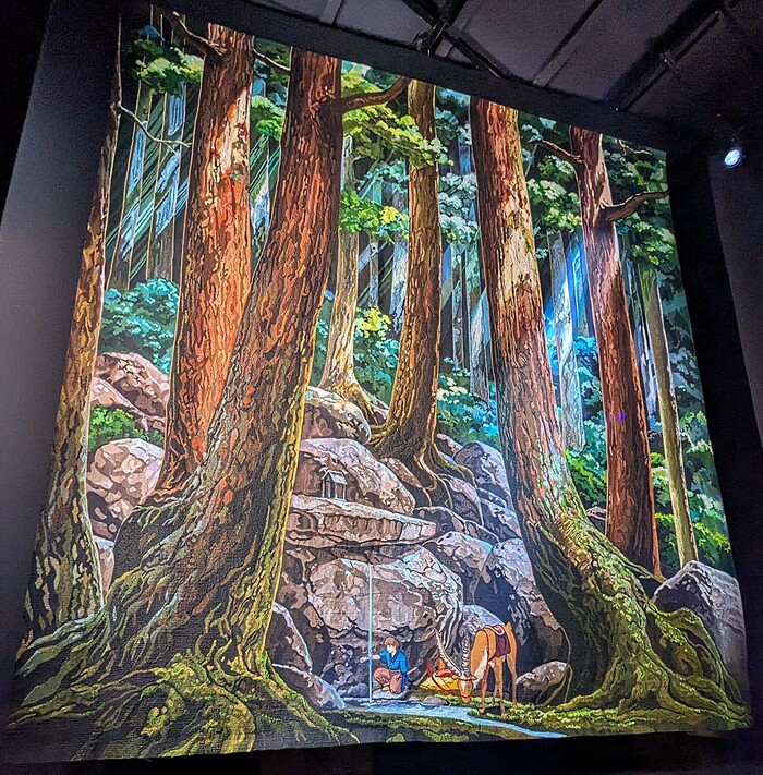 足を進めてさっそく目に入るのは、ジブリの『もののけ姫』の1シーン「呪いの傷を癒やすアシタカ」を織ったタペストリーと、パリのノートルダム大聖堂のキマイラ像。